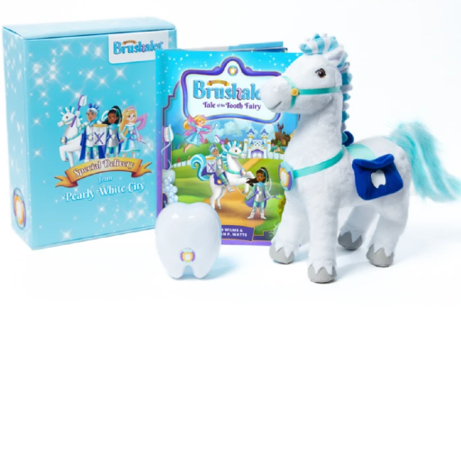 The Brushalot Tooth Fairy Kit™ (Storybook, nightlight, stuffed horse) gets your children to brush their teeth and have fun doing it, creating strong oral health habits in your children and creating a great new family tradition.