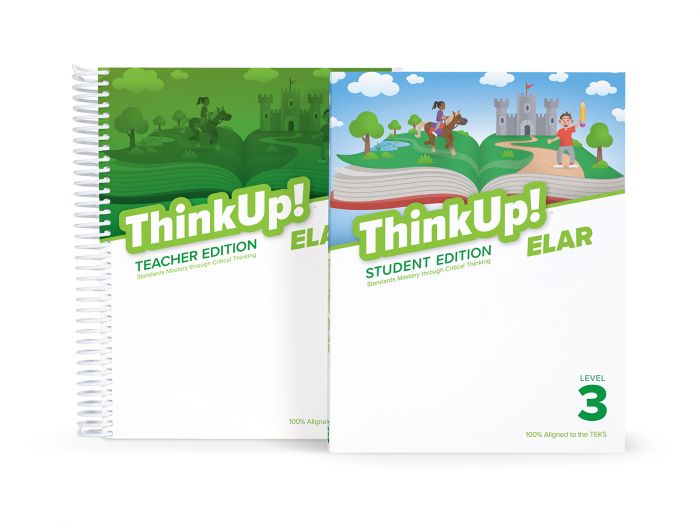 ThinkUp! ELAR (Grades 1-8) introduces the focus TEKS and the Critical Thinking traits that support students as they learn, practice, and master the TEKS concepts. ThinkUp! ELAR - English Language Arts and Reading - includes Getting Started, Instruction, Assessment, Intervention, and Extension components that help teachers engage and accommodate all learners.