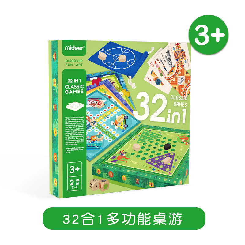 32 in 1 Classic Games is a new board game for young children, which contains 32 classic games at home and abroad, including Snakes and Ladders, Treasure Hunter, Animal Checker and other popular board games. This set is excellent for promoting reasoning skills, good judgement, strategic skills and resilience. It is a must-have for family time and parties, suitable for at least two people to play together, which helps promote social skills. The package includes a holder, 5 double-sided chessboards and various chess pieces. Creative ideas and designs can be seen both on the package and chessboards. There are at least two games available for each chessboard. The outer box can be used as a holder for players to secure a chessboard and enjoy fun games.