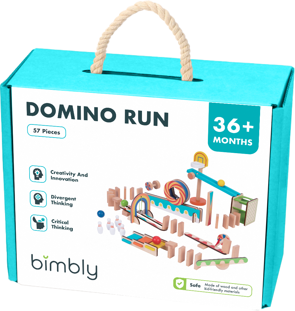 This product is a domino run that kids can place and than watch them fall in a sequence. We transformed the classical domino run application buy adding some extra gadget like wheels, slide, rotating items, balls... to add creativity and imagination to the kids using it. It's kind of a rube Goldberg application. The kit allows kit to create, learn physical reactions and dynamics, think divergently, enhance their motor skills, and enhance their problem solving skills while experimenting and having fun.