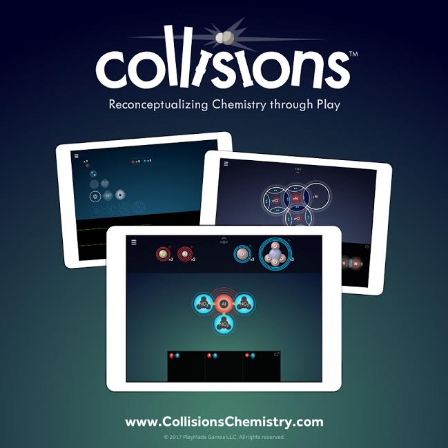 Collisions was created by a team of educators, scientists, designers, and developers on a mission to teach science concepts in an engaging and challenging way. Through extensive ideation, playtesting, and iteration, the Collisions team has built a flexible tool that teachers can use 1:1, within a flipped classroom, to introduce a lesson, or for student practice. Collisions also couples immersive play with immediate and meaningful feedback to engage students of varying skill and interest levels. Collisions can be played on iPad or Android tablets, or online at www.playmadagames.com. Current content areas include Atoms, Ions, Covalent Bonding, Ionic Bonding, Acids, and Bases.