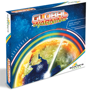 The whimsically titled Global Warning asks 4 to 7 players to challenge each other to solve the greatest number of environmental problems afflicting the Earth. At each turn, problem cards appear on different topics that, if not resolved with the right solution cards, cause an increase in the earth's temperature. To win, everyone must play as a team. If the temperature indicator reaches the maximum level all players lose the game!