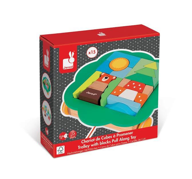 A pull-along toy to develop baby's motor skills. This lovely early childhood education toy also stimulates baby's dexterity and coordination, thanks to its many shapes: triangles, circles, squares...Wooden toy (beechwood and chinese cherry). Includes 15 wooden blocks. Water-based paint. FSC Certified. String length: 50 cm. Non-skid silent rubber wheels. Closed color box.