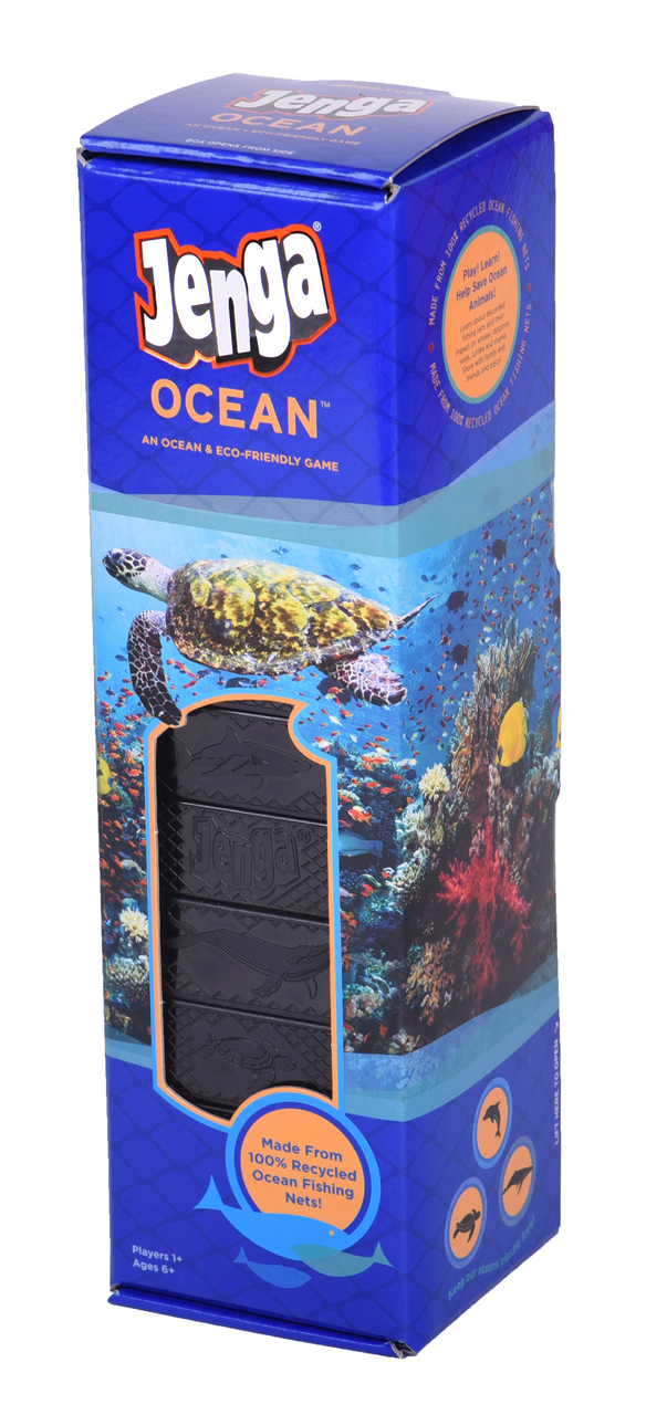 Each set of Jenga® Ocean™ game blocks is made from over 25 square feet of recycled fishing nets. The use of this recycled material will help reduce the continuing accumulation of plastic fishing nets in the ocean, helping to protect ocean sea life and ecosystems.