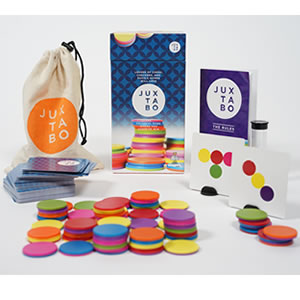 Juxtabo is a fun 3D game where players match and stack colorful pieces to create patterns on the challenge cards. The board is different every single game, because players create the board with Juxtabo pieces.