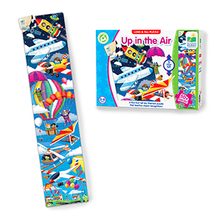 This well-designed puzzle is five feet of engaging images with bold and vibrant colors perfect for younger children. The images start with the ground and continue up through a sky filled with parachutes, hot air balloons, and airplanes, and continue all the way into outer space where a cute alien awaits. This puzzle is a whole lot of fun!