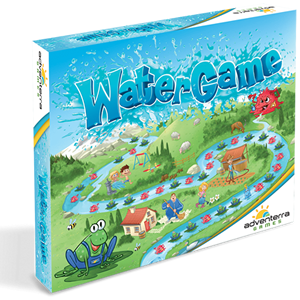 Learn the value of clean water in this cooperative game. Players roll dice, float down the river, and draw "Savings" or "Wasting" cards. Unlucky players must rely on the community water jug, which requires donations from players who have saved more water. If the jug is empty when someone needs it, everyone loses — so let the negotiations begin! Ideal for 3 to 4 players. Play can be completed in about 30 minutes