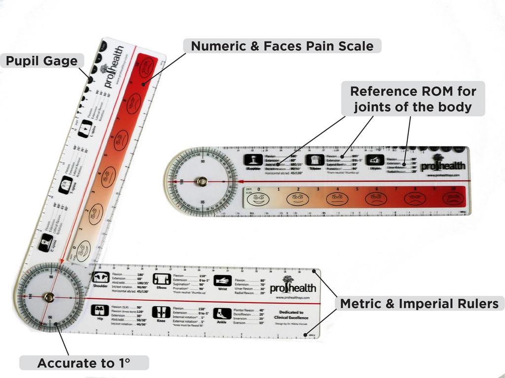 A great, all in one, gonimeter with reference ranges for most joints! So easy to use when the range of motion is listed right on the meter. A great tool to look at progress of therapies by using with each visit. Pain scale with any range of motion problems also adds assessment data for diagnosis and treatment.