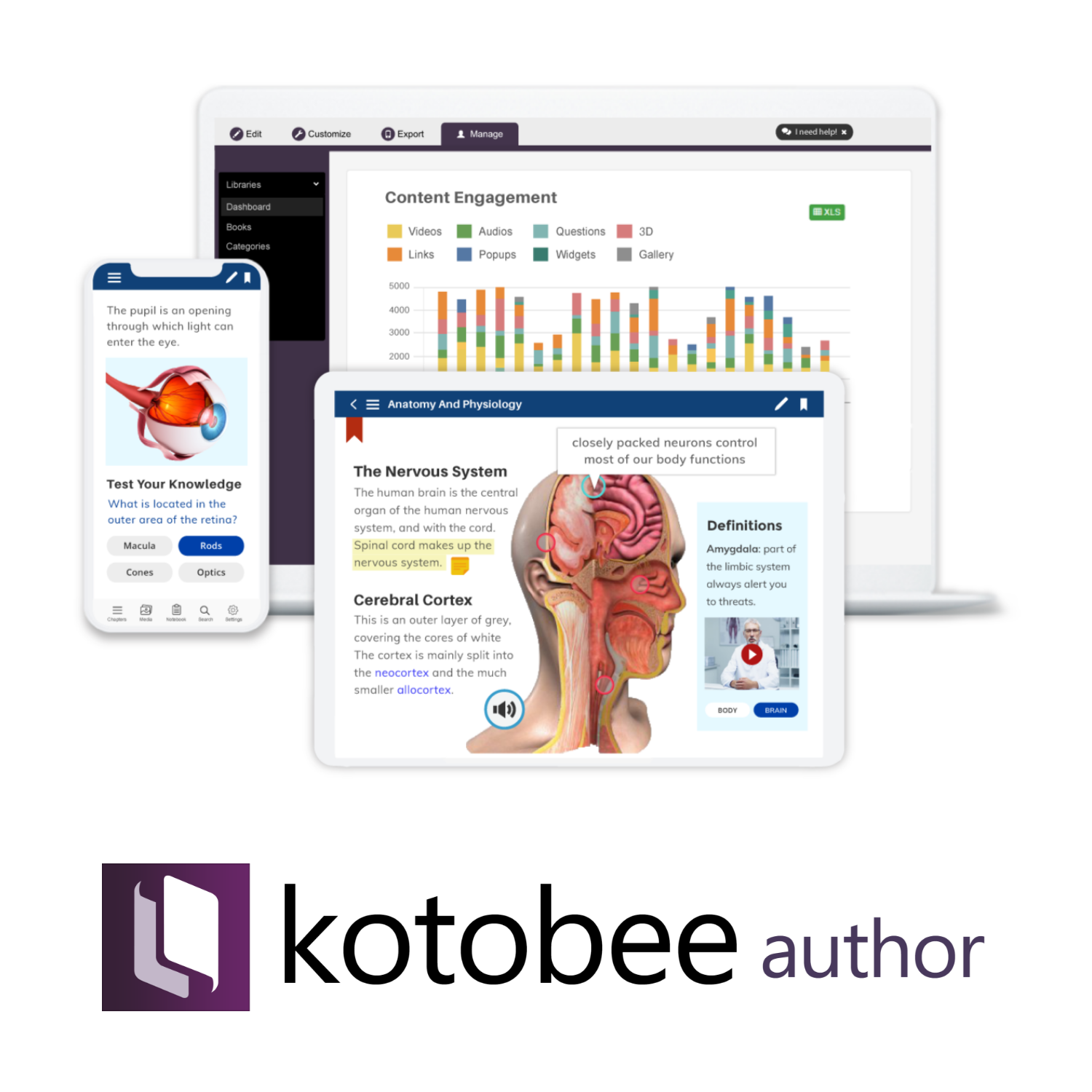 Kotobee Author allows teachers and educators to export their ebook to more than 12 different formats, saving the cost of using multiple tools to cover a range of target formats. Teachers can also add their own theme design, branding and customization to interactive ebook apps (where a proprietary reader is embedded in the app). This allows teachers and educators to publish apps on the app stores with their institute's brand name, logo, internal look and feel, without any mention of Kotobee. They may as well integrate the interactive ebook as a SCORM package to integrate with their LMS and report student progress back to the LMS.
