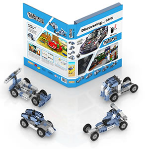 The ENGINO philosophy is to teach Technology through play. Based on this philosophy the ENGINO team decided to create a series of books which combine encyclopedia information with time traveling adventures. The 64-page children's book consists of 3 sections: the 1st section is the illustrated story of Alex who travels in time to meet the inventors of the car; the second section presents the technology behind the cars, speed records and the timeline of the development and finally the 3rd section contains detailed instructions of how to build 5 different car models using the Engino parts found in the book cover.