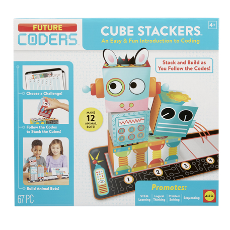 ALEX Toys Future Coders Cube Stackers lets tomorrows genius' stack cool cubes to make creatures! Challenge cards mimic computer programs with algorithms for building. Follow the sequence of arrows to build animals with cardboard cubes, then check the back of the card to see if you got it right! Add crafty elements for even more personality. Use the cards to make 12 robotic creatures or have fun creating your own! Includes 8 cubes, game board, puzzle cards, pipe cleaners, colorful punch-outs and easy instructions. Recommended for children 4 years of age and older.