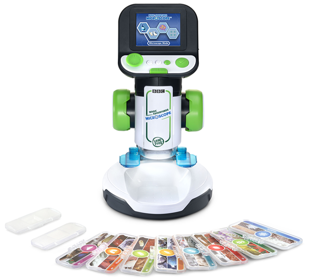 Explore tiny worlds full of huge discoveries with the Magic Adventures Microscope™. Young biologists can zoom in on flowers, animals, food, minerals and more using eight double-sided smart slides that activate amazing BBC videos and images. Discover answers to curious questions like: How do leaves changes colors? What do plant cells look like? What is sand made of anyway? Make your own discoveries by finding things around the house and getting a closer look using the reusable slides or large sample tray. You'll be amazed what you can see with up to 200x magnification on this real microscope. See something incredible? Capture and save the on-screen images. Game time! Defend microorganisms from micro-invaders or put your skills to the test with the What's This? quiz.