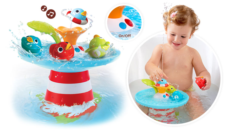 Four fun duckies race 'round and 'round this award-winning, battery-operated, musical bath toy that draws water from the tub and creates a unique fountain and race track. Features four mischievous ducks that magically chase each other around an amazing water display while cheerful music plays. Each duck features a unique different water spraying effect and the leaf lever activates 9 random sound & water effects. Automatic shut-off after 3 minutes. Developmental benefits include: learning through sensory play, introduction to cause and effect processes, eye-hand coordination and fine motor skills development.