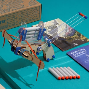 Tinkerer offers STEAM activities for curious minds. In our Explore box Repeating Crossbow, you'll construct your own repeating crossbow by following the graphic instructions. Shoot at the targets to practice your aim and compete against your friends. In the magazine, learn about the history of the crossbow, how the crossbow stores kinetic energy and how lever systems work.