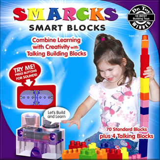The Smarcks Building Set has 70 standard building blocks and four 2nd generation talking blocks. The new Smart Blocks have 300% more teaching capacity and have been programmed with a progressive learning function - as children get older they play differently and the blocks are programmed to react differently. Very young children can press the buttons in the blocks or stack them on one block at a time. This is the discovery stage and the Smart Blocks sing, play nursery rhymes and sound effects, laugh, and talk about colors and good manners. As children develop their fine motor skills they begin to stack on two blocks at a time. Play now moves to a higher level and the Smart Blocks teach spelling, counting, math, and puzzle solving. The set comes with a Puzzle Builder Guide to show children how to stack the blocks to solve the Music Block puzzle and with an ABC chart with pictures that match the words the blocks spell. Smart Blocks combine the educational benefits of electronic toys with the creativity of building blocks to provide years of entertainment and learning.