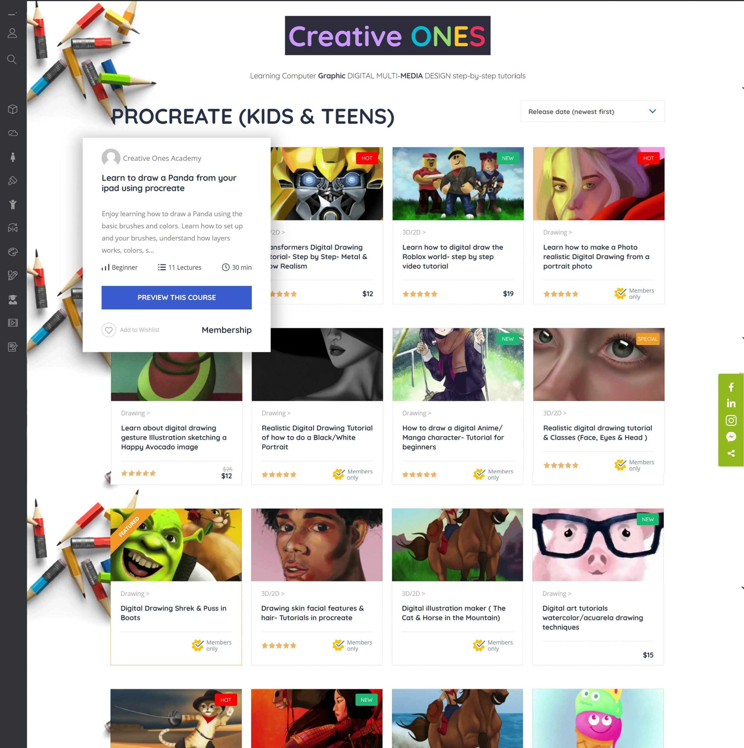 The Digital Art Academy from CreativeOnes offers various graphic design programs for users to learn skills such as animation, Photoshop, digital sketching, and more! Whether you're a beginner or looking to advance your skill set, you will have help from a handful of step-by-step tutorials and access to online and live classes taught by instructors. There are also Summer and Winter camps available to help young students participate in creative, productive outlets that keep them engaged during breaks from school.